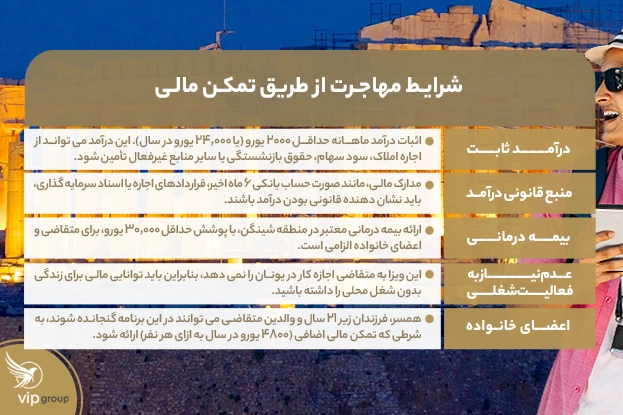 مهاجرت از طریق تمکن مالی: این روش برای افرادی مناسب است که درآمد ثابت و کافی از خارج یونان دارند، مانند بازنشستگان یا فریلنسرها. متقاضی باید اثبات کند که درآمدی حداقل ۲۰۰۰ یورو در ماه (۲۴,۰۰۰ یورو در سال) دارد، که می تواند از اجاره املاک، سود سرمایه گذاری یا حقوق بازنشستگی تأمین شود. این روش نیازی به فعالیت اقتصادی در یونان ندارد و اقامت یک ساله قابل تمدید ارائه می دهد. برای اطلاعات بیشتر راجب تمکن مالی یونان کلیک کنید.