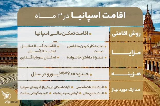برای دریافت اقامت اسپانیا از طریق تمکن مالی، باید ماهانه حداقل ۲7۰۰ یورو درآمد ثابت غیرفعال (passive) داشته باشید. این درآمد می‌تواند از روش‌هایی مانند سود سپرده بانکی، سود سهام یا اوراق قرضه، اجاره املاک و مستغلات، و یا سایر روش‌هایی که حاصل از کار کارمندی نیست، تأمین شود. اگر به‌ دنبال مسیری امن و قانونی برای مهاجرت هستید، تیم تخصصی VIP Group Visa در کنار شماست تا اقامت تمکن مالی اسپانیا را به ساده‌ ترین شکل ممکن برایتان فراهم کند.